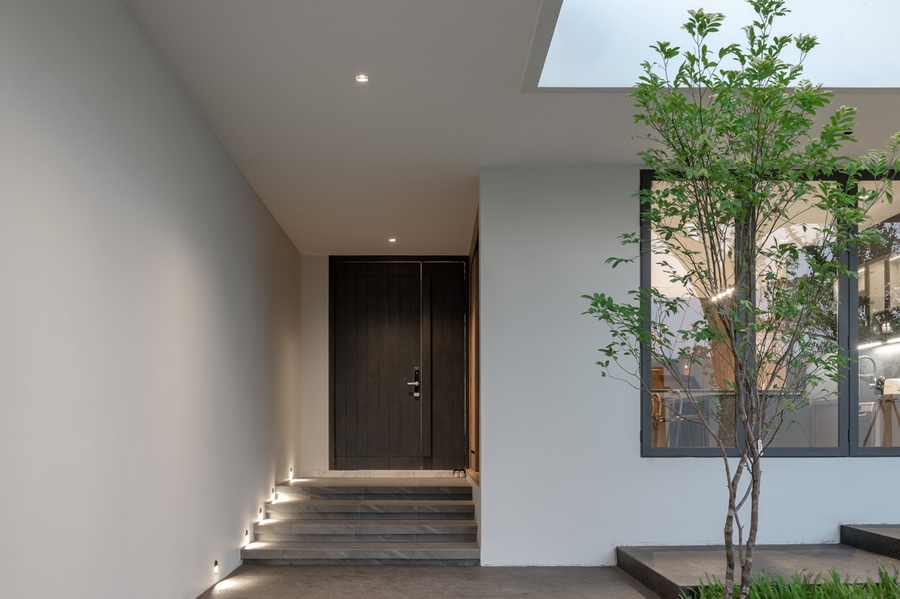 Thiết kế một bức tường bê tông vững chắc ngăn lối vào phía trước với không gian riêng tư bên ngoài. Một phần tường được thiết kế nhô ra kèm hệ thống đèn chiếu sáng giúp che mưa và thêm ánh sáng cho lối vào nhà lúc về đêm.