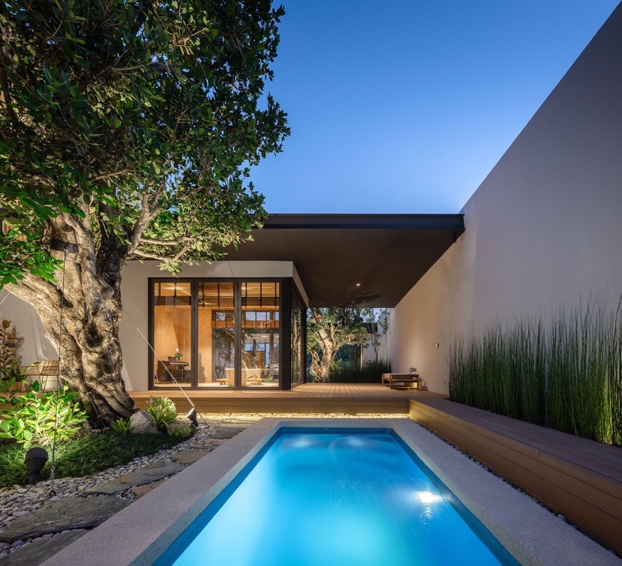 Thiết kế hồ bơi nhỏ phía sau sân vườn trải dài với làn nước xanh mát bên cạnh những hàng cây xanh mang đến bầu không khí thoáng mát. Bề mặt nước hồ tĩnh lặng như phản chiếu bầu trời trong xanh trên cao.