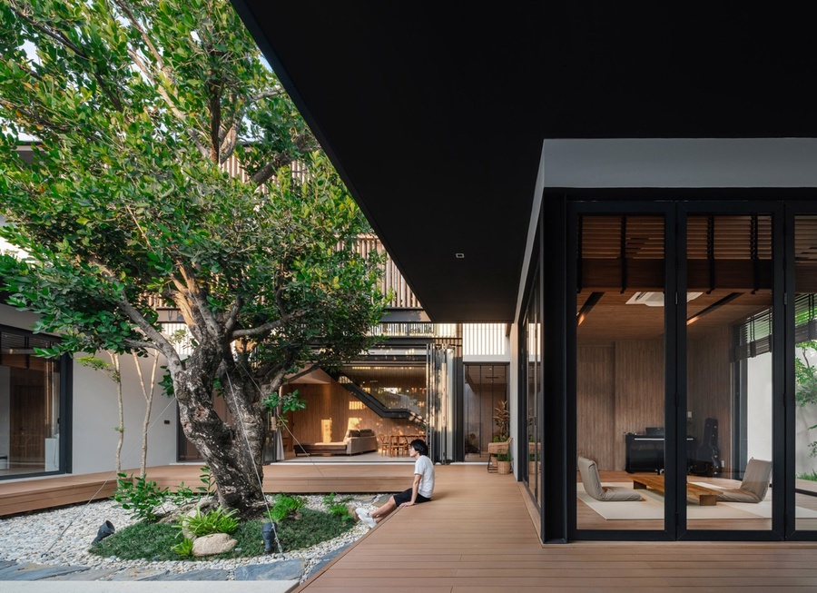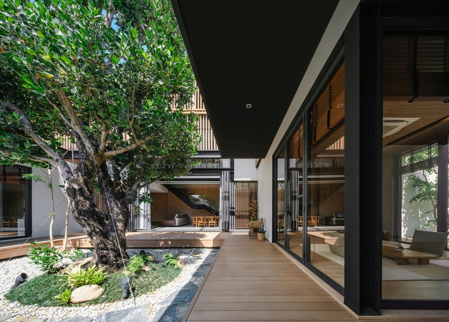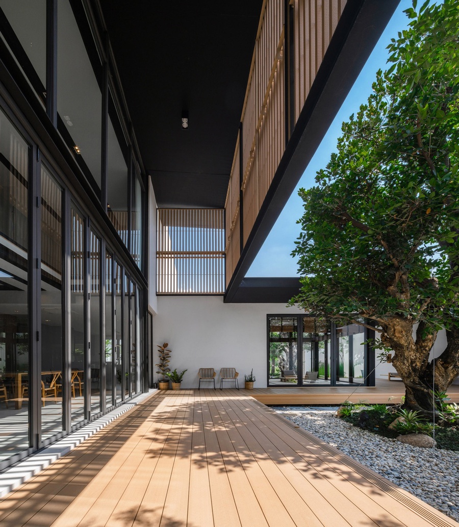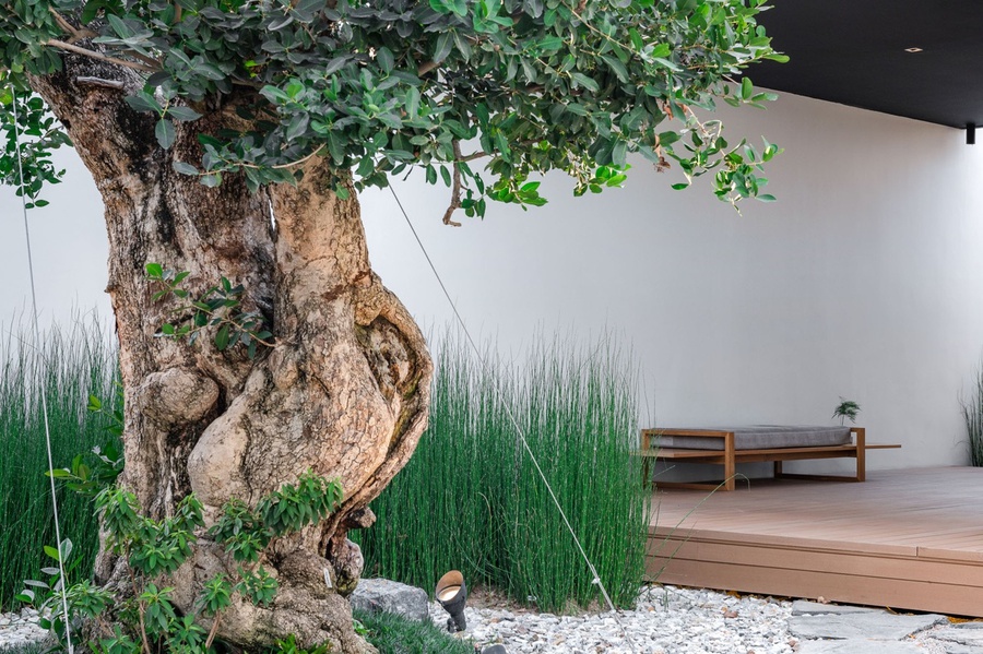 Thiết kế độc đáo và khéo léo khi xây một sàn gỗ xung quanh cây cổ thụ lớn ở sân trong, đây là một nơi lý tưởng để ngồi thư giãn lúc chiều tà và nơi chủ nhà có thể dừng lại một chút để ngắm nhìn quang cảnh xanh tươi đầy sức sống của sân vườn.