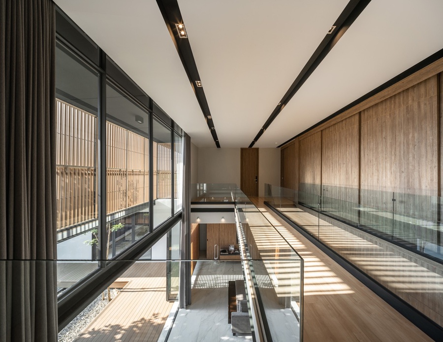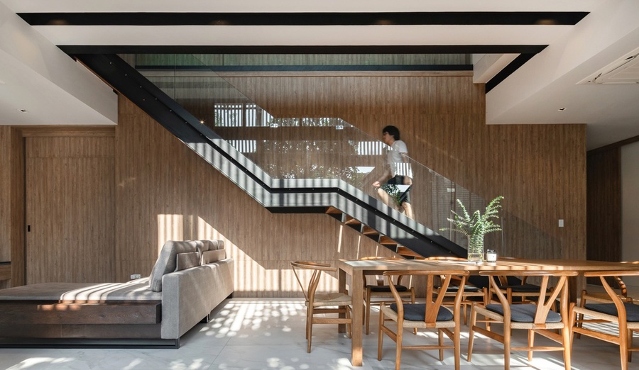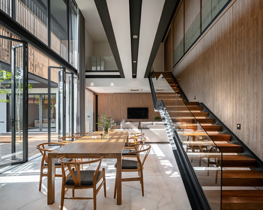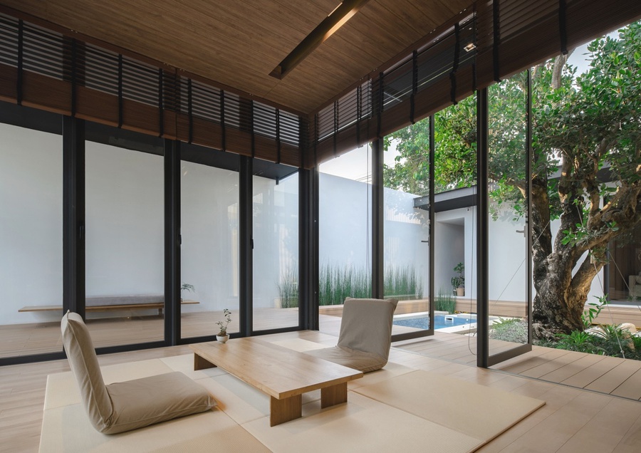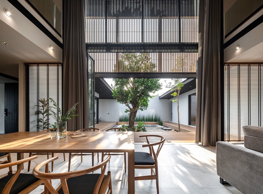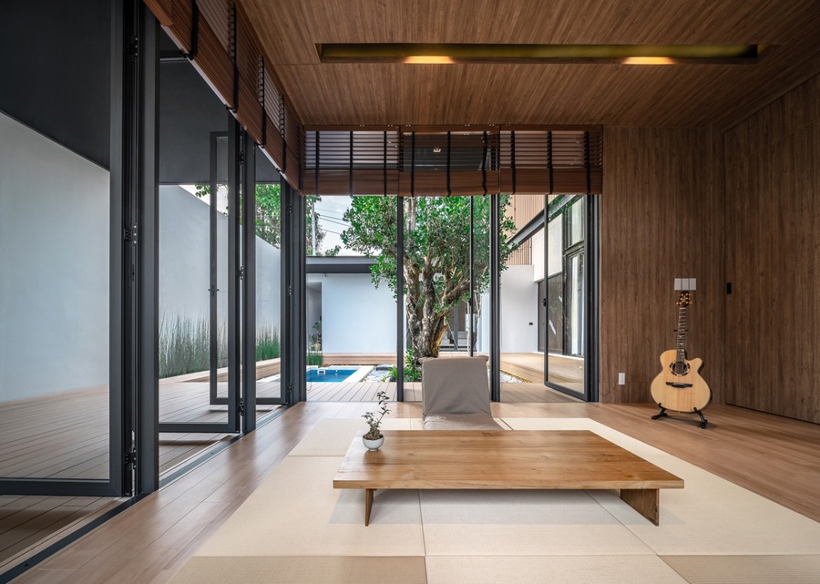 Ngôi nhà với thiết kế nội thất theo phong cách hiện đại, tối giản và yên bình phù hợp với khí hậu nóng và mưa của Chiang Mai, Thái Lan. Về tổng thể, ngôi nhà rộng 650 mét vuông, thiết kế hiện đại ấn tượng với ba sân thiền nhìn sang trọng nhưng hài hòa. Các khu vực ngoài trời giáp với lối đi có mái hiên che mưa nắng. Các tấm ván gỗ từ mái nhà ngăn ánh sáng mặt trời trực tiếp chiếu vào không gian bên trong nhà. Những cây cổ thụ tạo thêm vẻ uy nghiêm cho sân trong khi không gian nội thất đương đại được trang trí bằng những đồ nội thất tối giản. Tông màu gỗ làm ấm căn nhà kết hợp với cách trang trí đơn sắc càng tô điểm thêm cho vẻ đẹp của thiên nhiên trong nhà.