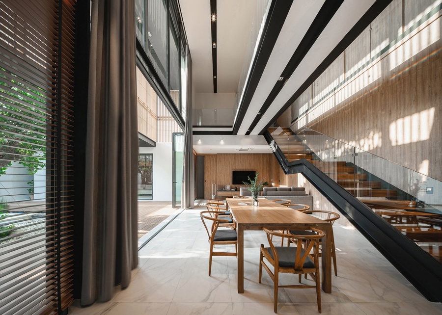 Khu vực ăn uống được thiết kế dạng mở cho ta tầm nhìn toàn cảnh ra sân sau, ngoài ra bố trí thêm tấm rèm lớn giúp gia chủ linh hoạt hơn trong việc gia giảm độ sáng vào nhà.