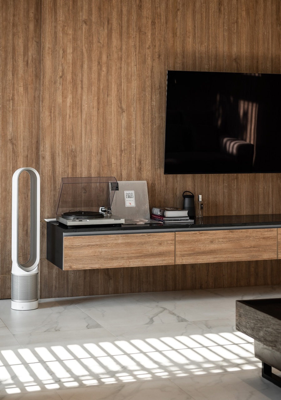 Đặt quạt không cánh Dyson đầy phong cách ở phòng khách giúp khu vực tiếp khách luôn mát mẻ.