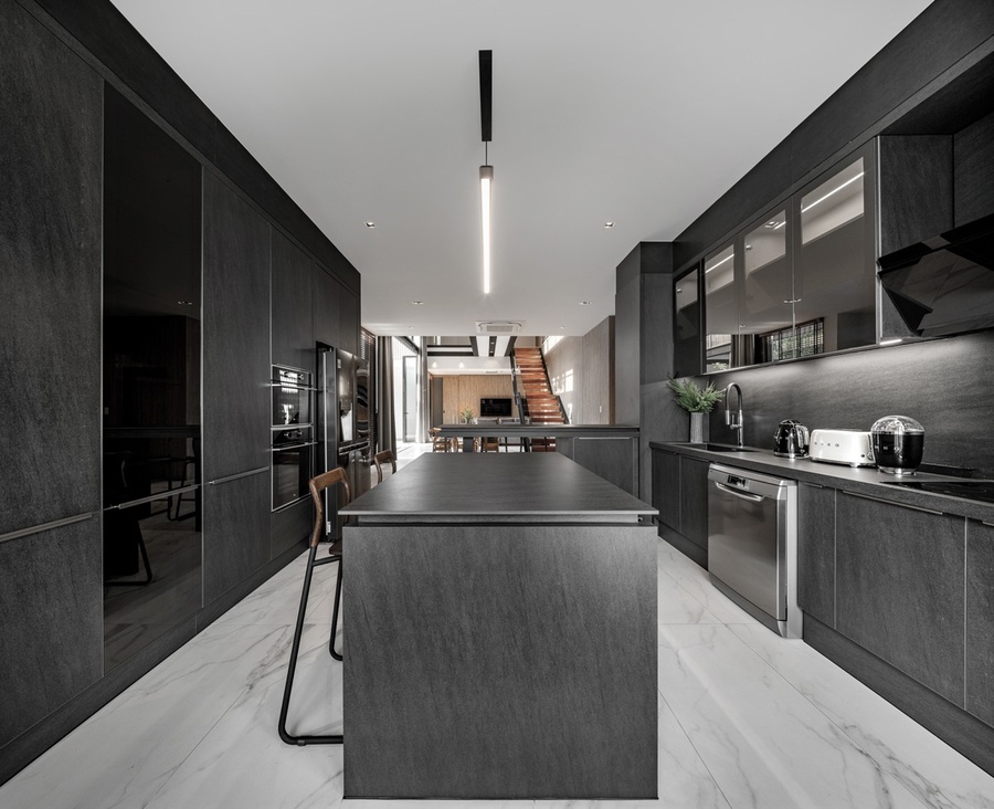 Phòng bếp được đặt ở phía đối diện cửa phòng ăn thiết kế thêm tủ bếp màu xám đậm tạo ra sự tinh tế, nhẹ nhàng và đơn giản.