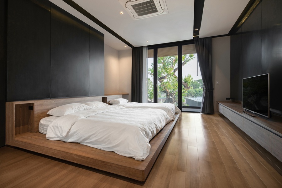 Khu vực giường ngủ được thiết kế thêm tủ đầu giường giúp có thêm không gian lưu trữ đồ đạc cho phòng. Một TV được đặt trong phòng tạo không gian giải trí và nghỉ ngơi cho gia chủ. Căn phòng thiết kế bằng gỗ khớp với giường một cách mượt mà.