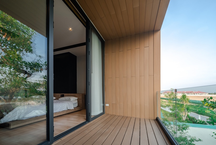 Ban công phòng ngủ riêng được thiết kế ốp ván gỗ tạo nên sự ấm áp cho phòng.
