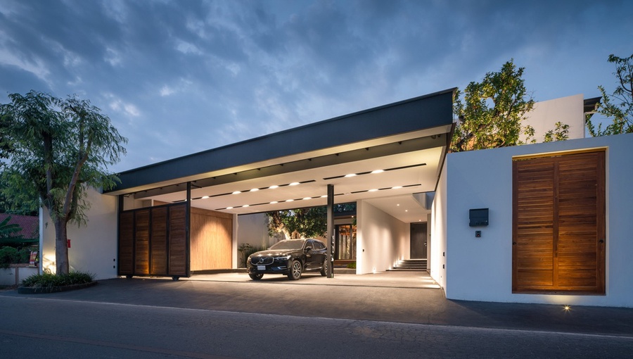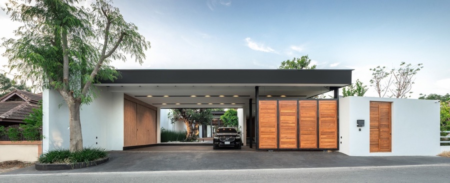 Cửa nhà để xe thiết kế theo cả hai hướng cho phép sự linh hoạt trong việc để xe theo ý muốn của chủ nhà. Cửa nhà bên phải được thiết kế để mở ra sân vườn của ngôi nhà.