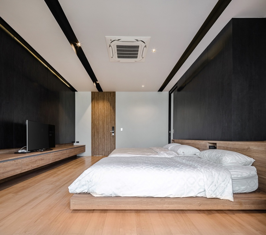 Phòng ngủ với thiết kế hai tông màu đen trắng và kết hợp với thiết kế giường phản gỗ độc đáo tạo cảm giác đơn giản nhưng tinh tế.